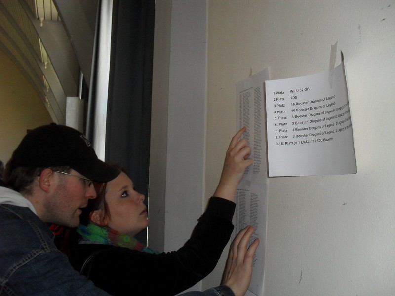Wenn man nun seinen Gegner gefunden hat, das Match gespielt hat und ein Ergebnis feststeht, habt ihr einen Zettel erhalten, auf dem euer Name, der Name eures Gegners und die Option auf Draw, also ein Unentschieden und Drop, mit welchem man sich aus dem Turnier austragen lassen kann, steht. Diesen Ergebniszettel müssen beide Spieler unterschreiben und es muss der richtige Spieler als Sieger (oder halt ein Draw, falls es eines war), angekreuzt werden.